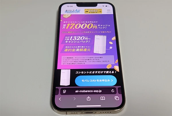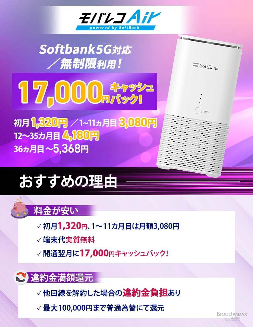 さらに、モバレコAirでは、17,000円キャッシュバックがもらえるキャンペーンを開催中です。