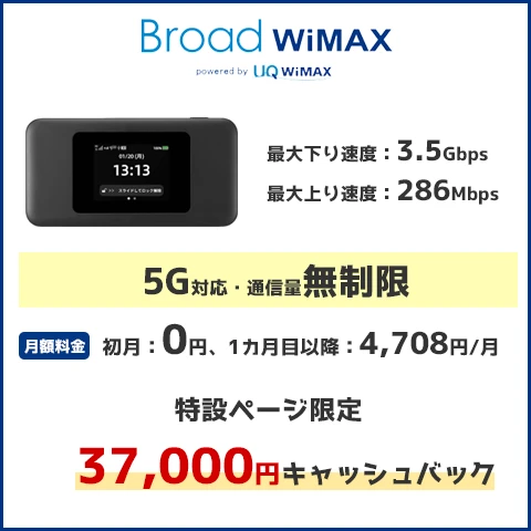 Broad WiMAXは、WiMAXの中でも料金が安く(初月0円、1カ月目以降月額4,708円)、高額キャッシュバック(37,000円)がもらえます。