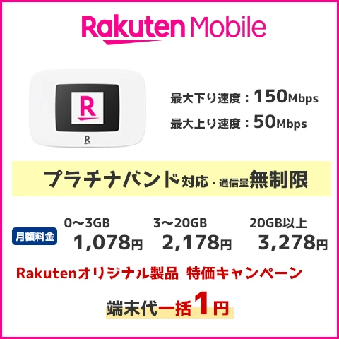 ■Rakuten WiFi Pocket Platinumは「楽天モバイル」から端末代1円にて購入可能