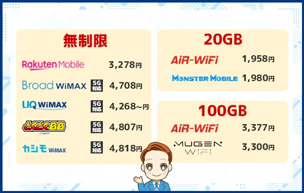 AiR-WiFi 解説へ進む | 20GB~ | 1,763円~ | 20.11Mbps | 月20GBと月100GBが格安+1カ月お試し可能【当記事限定】月額永続10%OFF※当サイト限定特典あり |