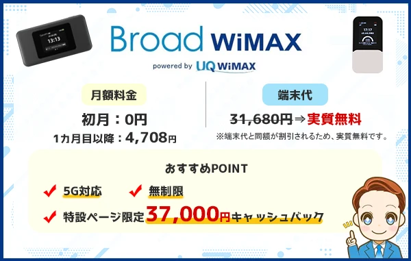 Broad WiMAXは、通信量無制限5G対応となっており、それなのに3年間利用した場合の実質月額は3,680円と安い料金です。