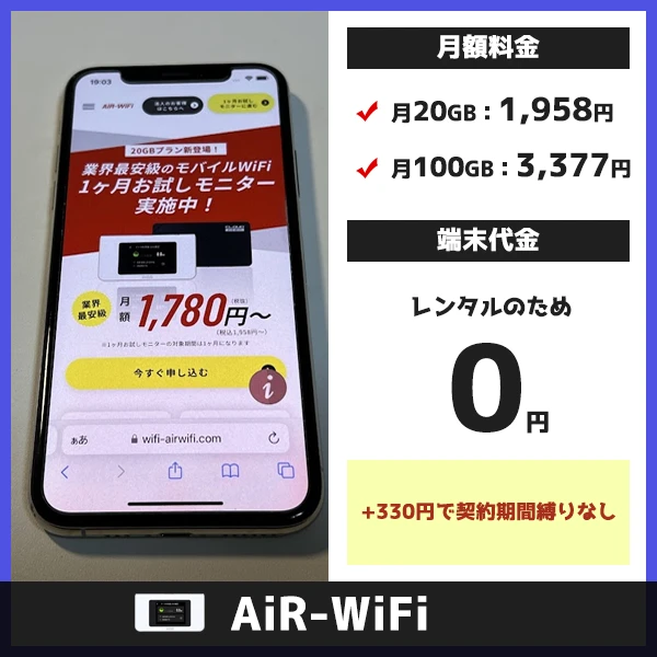 AiR-WiFiは、月20GBと月100GBの取り扱いがあり、月額1,958円~利用できます。