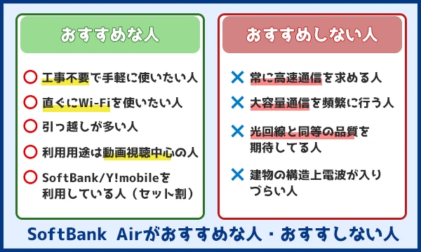 これらに当てはまる場合は、SoftBank Airの利用に適している可能性が高いため、おすすめできます。