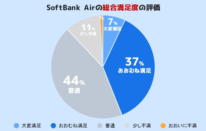 SoftBank Airの総合満足度を調査したところ、「満足」が44%、「普通」が44%、「不満」は12%という結果になりました。