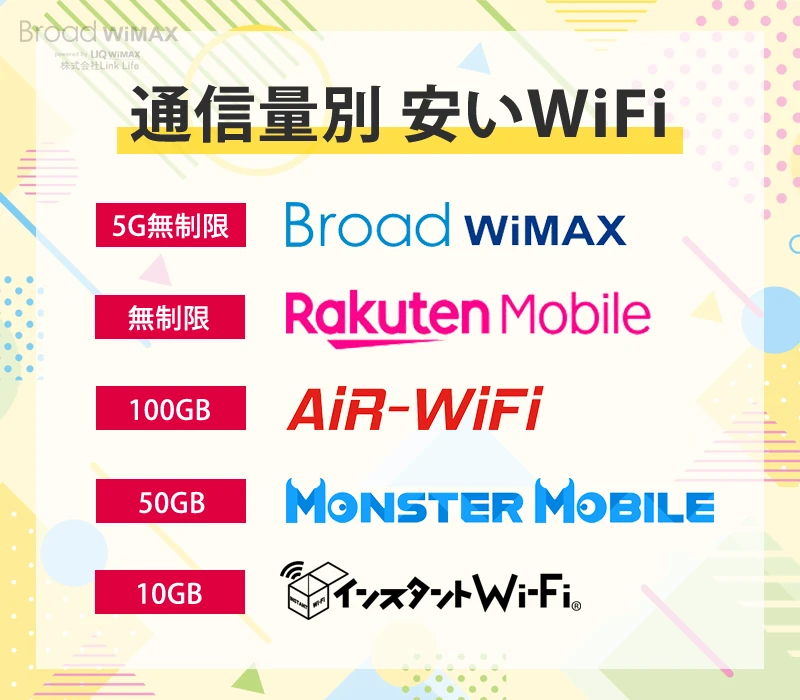 通信量別の安い料金で利用できるWi-Fiサービスを調査しました。