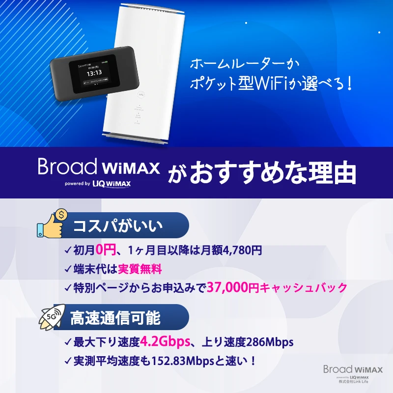 Broad WiMAXは5Gに対応しており、通信量も無制限です。