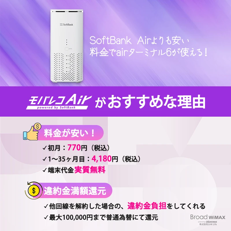 SoftBank Airのコラボモデル「モバレコAir」は本家のSoftBank Airよりも安い料金でホームルーター(挿すだけWiFi)が利用可能です。