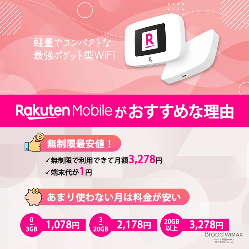 楽天モバイルのモバイルWiFiが通信量無制限で、月額3,278円にて利用できます。無制限Wi-Fi最安値です。