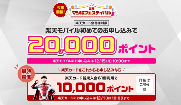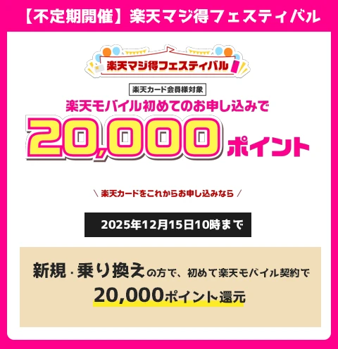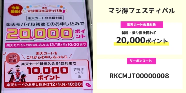 | マジ得フェスティバル | 楽天カード会員対象、はじめて楽天モバイル契約で20,000ポイント | RKCMJT00000005 |