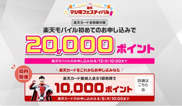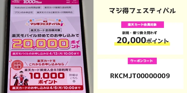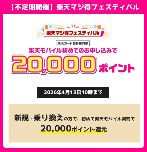 | マジ得フェスティバル | 楽天カード会員対象、はじめて楽天モバイル契約で20,000ポイント | RKCMJT00000008 |