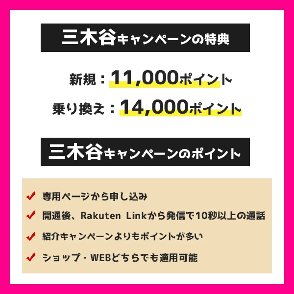 三木谷キャンペーンでは、楽天モバイルを契約すれば、ほぼ無条件で乗り換え(MNP)は14,000ポイント、新規は11,000ポイントをもらうことができます。