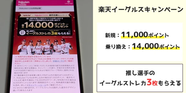 新規11,000ポイントもらえる、乗り換え14,000ポイント、さらに推し選手のデジタルカードプレゼント - 楽天イーグルスキャンペーン