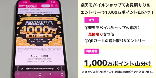 一人一回まで1,000ポイント - 楽天モバイルショップでお見積もり&エントリーで総額1,000万ポイント山分け!