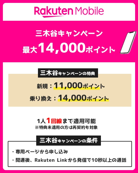 三木谷キャンペーンは専用ページから申し込みを行い、開通後にRakuten Linkアプリにて発信で10秒以上の通話を行うと、乗り換えの方は14,000ポイント新規契約の方は11,000ポイントをもらえます。