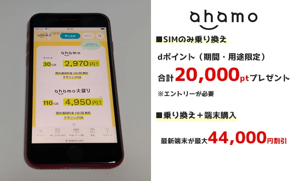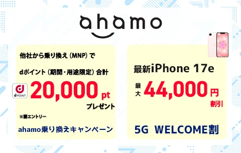 ahamo|SIMのみ乗り換えで最大20,000ポイント還元(dポイント・期間用途限定)、iPhoneは「5G WELCOME割」で大幅値引き