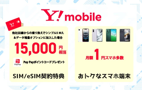 Y!mobile(ワイモバイル)|SIMのみ乗り換えで最大15,000円相当、端末セットなら月額1円スマホが豊富