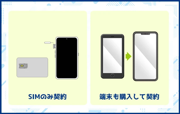 乗り換えを行う際は、現在使用しているスマホをそのまま使う「SIMのみ契約」にするか、新しい端末を購入する「端末セット(端末も購入して契約)」にするかを決めます。
