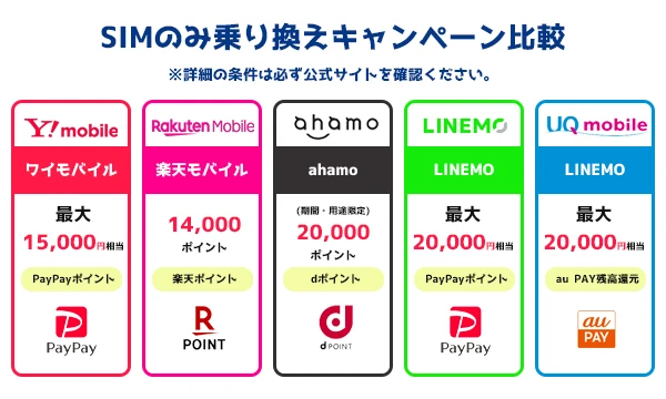 SIMのみ乗り換えの還元額は14,000ポイント〜20,000円相当まで幅があり、ワイモバイル・ahamo・UQモバイルは高額な特典が用意されています。