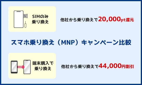 SIMのみの乗り換え(MNP)では、最大20,000ポイント還元、端末を購入しての乗り換え(MNP)の場合は、最大40,000円割引(税抜)など、各社がお得なキャンペーンを実施しています。