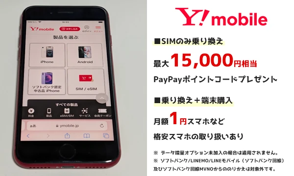 | ワイモバイル | 最大15,000円相当 | PayPay |