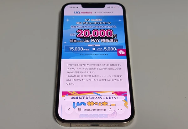 | UQ mobile SIMデビューキャンペーン | 乗り換え(MNP)は最大20,000円相当のau PAY残高還元 ※2026年5月11日まで期間限定増額中 |