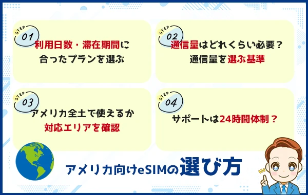 特に、初めてeSIMを利用する方や、アメリカ滞在中のトラブルが不安な方は、日本語サポートの有無やサポート対応時間を重視して選ぶと安心です。