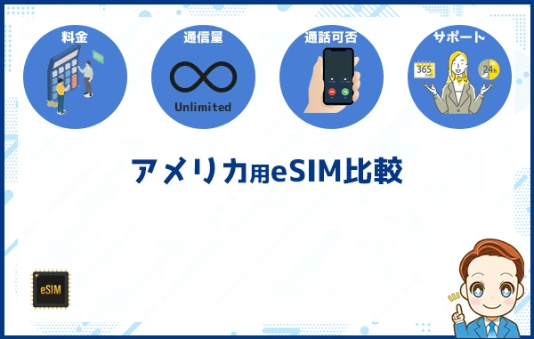アメリカで利用できるeSIMは、サービスごとに無制限プランの有無、利用できる日数、サポート体制、日本語対応の有無などが異なります。