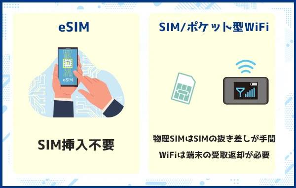 SIMカードの場合は差し替え作業が必要になりますが、eSIMならその手間がなく、紛失の心配もありません。