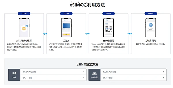 さらに、World eSIMの公式サイトでは、eSIMの利用方法の流れ、設定方法が画像付きで掲載されているため、流れがわからないという人にも、わかりやすく解説されています。