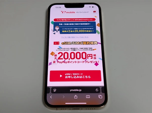Y!mobileの公式オンラインストアからSIMのみの契約をすると、最大20,000円相当のPayPayポイントコードがもらえます。