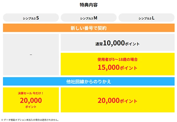 対象者新規契約、他社(ドコモ・au等)からのMNP乗り換え、または旧プランからシンプル3 S/M/Lへのプラン変更で申し込んだ方