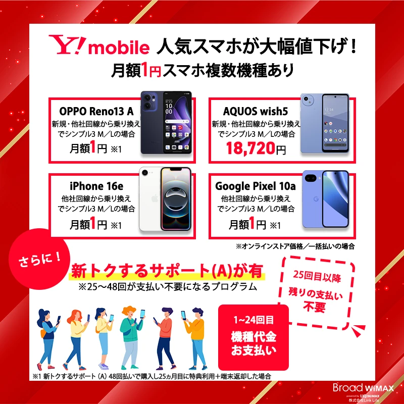 ワイモバイルでスマホ購入はお得!実質1円スマホ「新トクするサポート(A)適用で、端末代24カ月間1円あり」